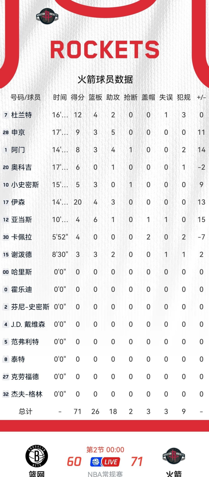 半场从球队数据来看,火箭队在多项关键数据上都占据明显优势。得分方面,火箭以71分领先篮网11分。篮板球争夺上,火箭抢下26个,篮网仅18个,火箭在篮板球控制上优势明显,这也为球队创造了更多二次进攻机会。助攻数火箭18次,篮网14次,体现出火箭队更好的团队配合。抢断火箭2次,篮网1次;盖帽火箭3次,篮网0次,说明火箭队在防守积极性和护筐能力上表现更出色。